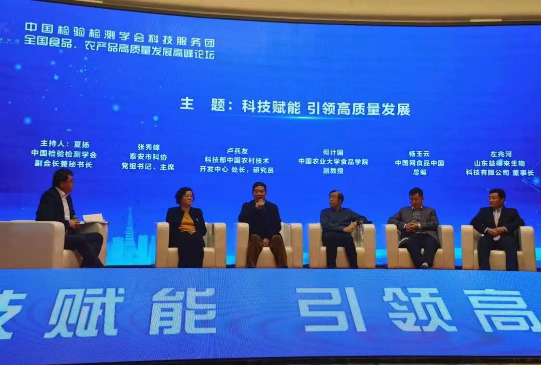 中国检验检测学会副会长兼秘书长夏扬还现场对泰安市科协党组书记、主席张秀峰,科技部中国农村技术开发中心处长、研究员卢兵友,中国农业大学食品学院营养与食品安全系副教授何计国,中国网食品中国总编杨玉云和山东益得来生物科技有限公司董事长左兆河进行了圆桌访谈、探讨交流。